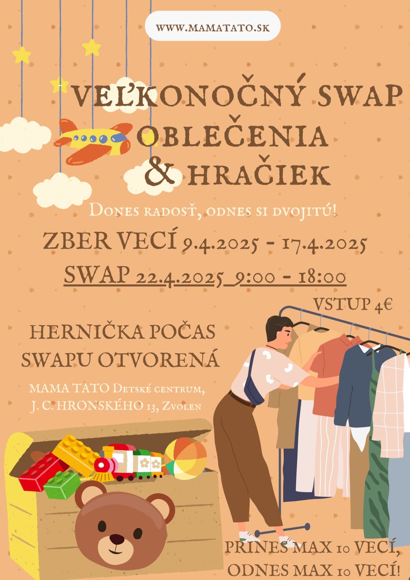 Kamoši, Váš záujem o náš/váš SWAP nás núti urobiť rovno ďalšíííí! Veľkonočný utorok strávime opäť vymieňaním vecí. Zbierame DÁMSKE, PÁNSKE A DETSKÉ OBLEČENIE A HRAČKY. Všetko len na JAR/LETO. Opäť bude platiť pravidlo - prines 10, odnes si 10 vecí! Tešíme sa!