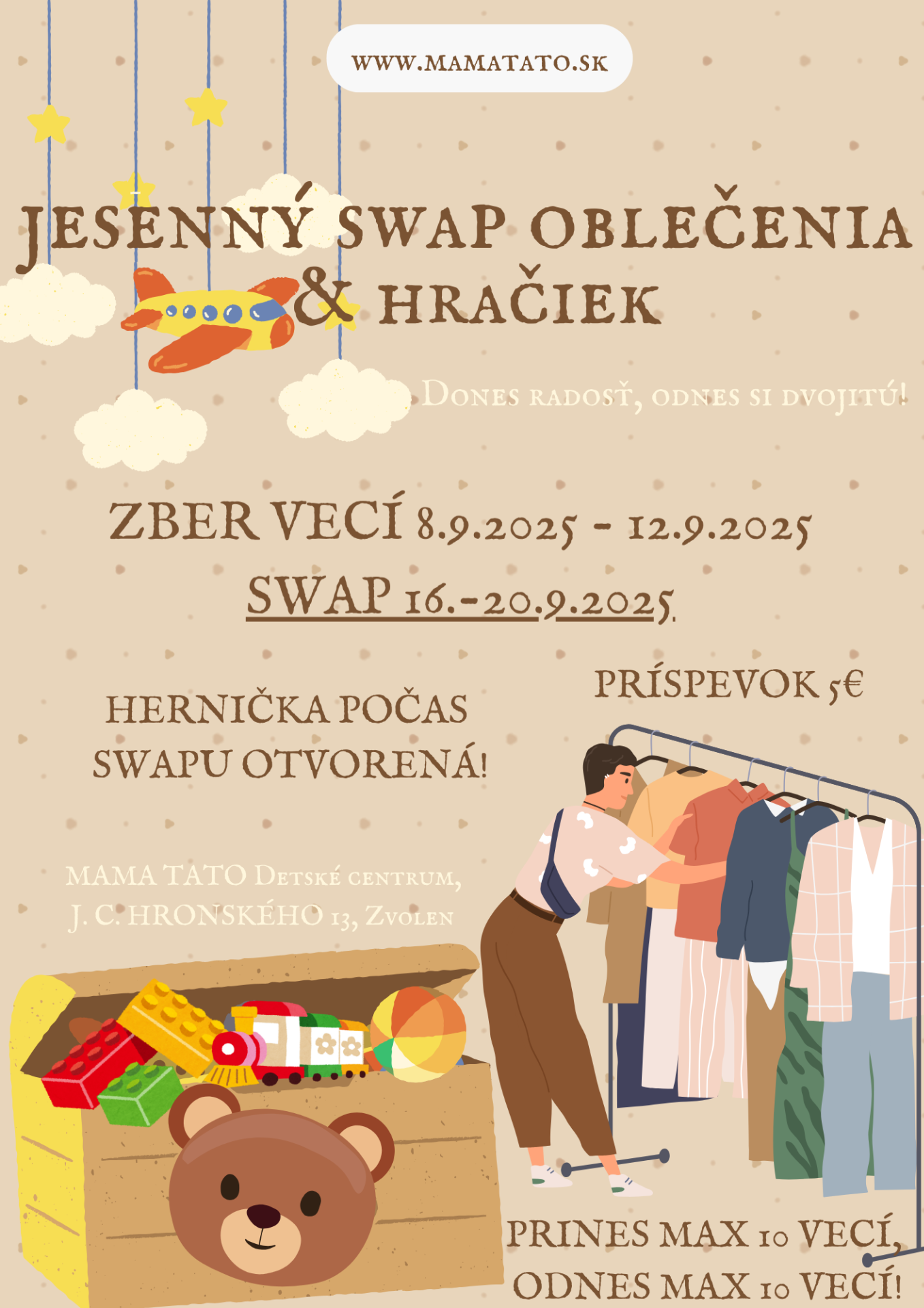 Na swap prosím nenoste spodné prádlo, plavky, plyšákov, nefunkčné hračky, staré alebo poškodené veci. Ak takéto veci pri preberaní nájdeme, nezaradíme ich do swapu. Ďakujeme za pochopenie.