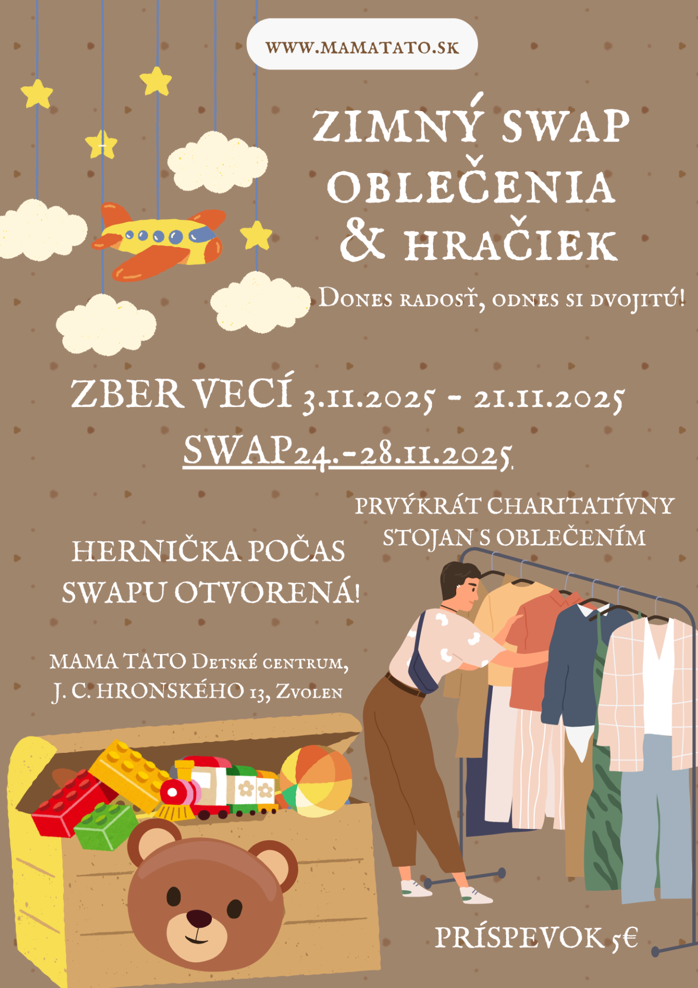Spúšťame zber oblečenia a hlásime posledný ZIMNÝ SWAP tohto roka! SWAPOVACÍ týždeň tentokrát potrvá v priestoroch mamatato celý posledný novembrový týždeň 24.-28.11.2025. Priniesť veci môžete od 3.11.2025 a prosíme, noste hlavne zimné oblečenie pre dospelých a deti, otepľovačky, snehule, čiapky, rukavice, pančušky, proste zimné oblečko, hračky, knihy a drobnosti do poličky ako ste zvyknutí. Letné veci nebudú zaradené, tie nám PROSÍM ANI NENOSTE! Prvýkrát bude u nás charitatívny stojan s oblečením, na ktorom budú veci v top stave alebo nové, a na nich nájdete 4 visačky so sumou. Ak si nejaký kúsok vyberiete, budete si môcť vybrať sumu, ktorou chcete prispieť. Pôjde o sumy 5, 10, 15 alebo 20€. Finančný výťažok z tohto charitatívneho stojana chceme venovať na dobrú vec. Ak viete o nejakej rodinke, ktorej by pomohlo každé €, napíšte nám. Spolu dokážeme pomôcť tam, kde je to nevyhnutné a darujeme tak niekomu možno krajšie Vianoce! Ďakujeme.