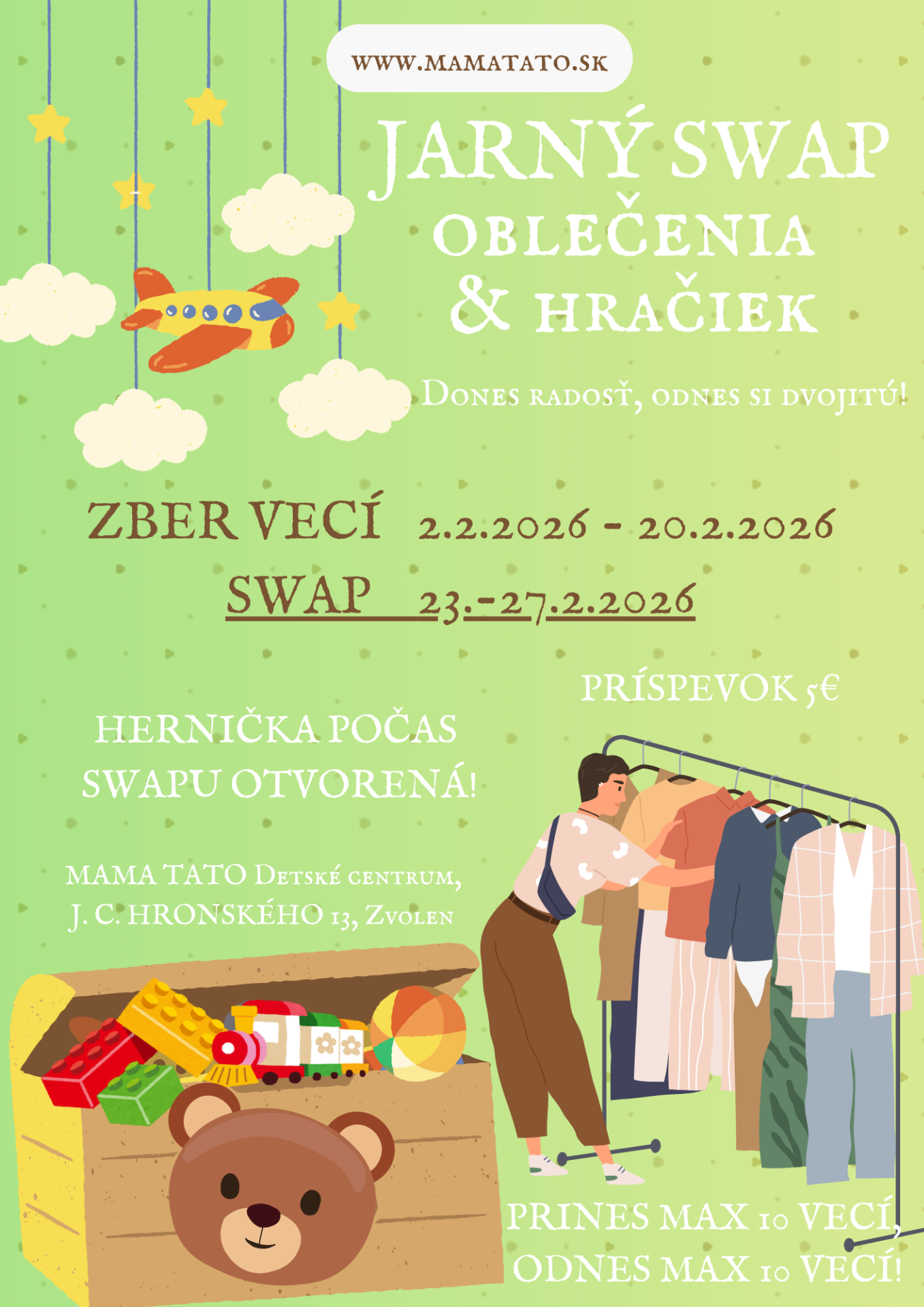 Na SWAP môžete priniesť jarné veci – dámske, pánske a detské, vrchné oblečenie (bundy, kabáty, trenčkoty, saká), nohavice, rifle, overaly, svetre, sukne, košele, blúzky, šaty, topy a doplnky (klobúky, šatky, kabelky, slnečné okuliare), drevené hračky pre deti, spoločenské hry, knihy a stavebnice. Prinesené veci by mali byť nepoškodené, čisté, vyprané, voňavé, funkčné, skrátka v takom stave, v akom by ste sa ich nehanbili darovať alebo ich priamo nosiť.